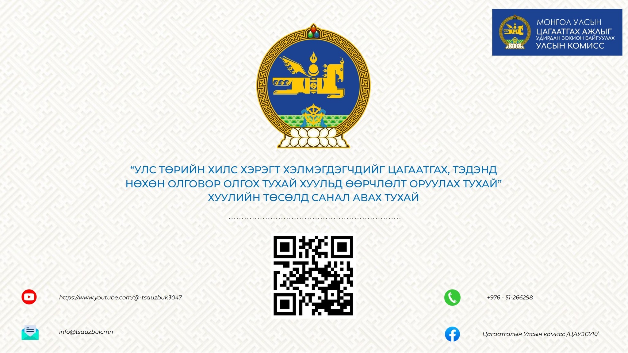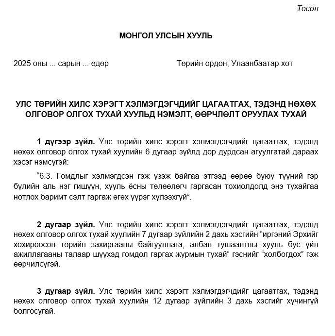 Иймд нэгэнт эрх нь зөрчигдөж амь нас, эрүүл мэнд, эд хөрөнгөөрөө хохирсон иргэдийнхээ хохирлыг нэгийг ч үлдээлгүй барагдуулж зохих нөхөн олговор олгох нь Монгол Улсын Үндсэн хуулиар тунхагласан хууль дээдлэх ёс, шударга ёс, тэгш байдлыг хангах төрийн үйл ажиллагааны зарчимд нийцэх тул "Улс төрийн хилс хэрэгт хэлмэгдэгчдийг цагаатгах, тэдэнд нөхөх олговор олгох тухай хууль"-д нэмэлт өөрчлөлт оруулж нөхөн олговор авч чадаагүй үлдсэн иргэдийн нэхэмжлэл гаргах хууль зүйн боломжийг нээх практик болон хууль зүйн шаардлага үүссэн байгаа тул уг хуулийн төсөлтэй танилцаж, 10 дугаар сарын 10-ны дотор саналаа өгнө үү.